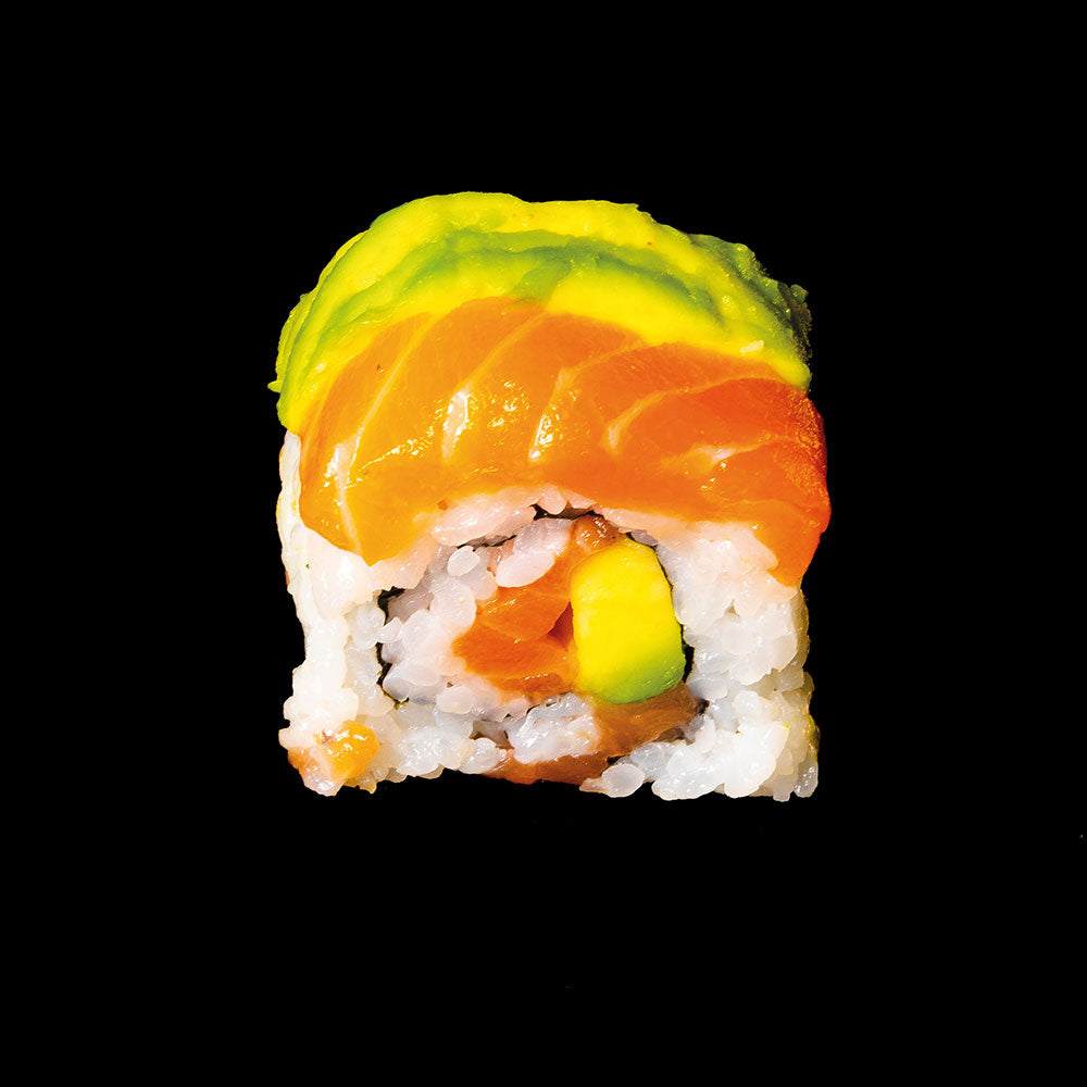 Sushi rice (white rice, water, vinegar sucrose, spirit vinegar, rice vinegar, salt, cane molasses, sugar), salmon, avocado, pickled ginger, soy sauce (water, wheat, soybean, salt), wasabi (Japanese horseradish, horseradish, natural mustard oil), rice seaweed, sesame seeds.